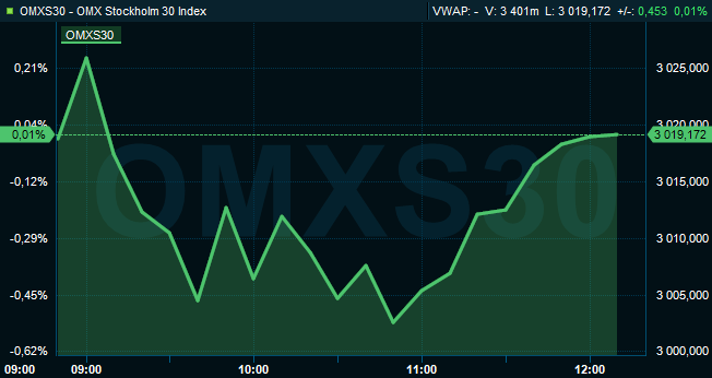 Klockan 12.10 var det svenska storbolagsindexet OMXS30 oförändrat på nivån 3.019. Då hade aktieaffärer för 5,9 miljarder kronor gjorts.