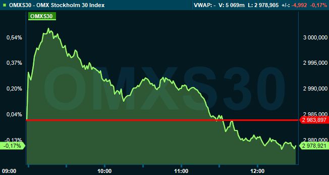 Klockan 12.30 hade det svenska storbolagsindexet OMXS30 sjunkit 0,2 procent till nivån 2.979. Aktieaffärer för 8,7 miljarder kronor var då omsatta på Stockholmsbörsen.