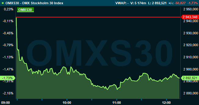 Vid klockan 12.15 var storbolagsindexet OMXS30 ned 1,7 procent till nivån 2.893. Justerat för avskild utdelning var OMXS30 index ned 1,5 procent. Aktier för omkring 7,4 miljarder kronor hade då omsatts på Stockholmsbörsen i sin helhet.