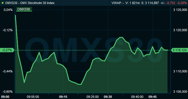 Efter knappt en timmes handel var storbolagsindexet OMXS30 ned 0,3 procent till 3.115. Aktier för drygt 3 miljarder kronor hade då omsatts på Stockholmsbörsen i sin helhet. Ute på de ledande Europabörserna var förändringarna små på båda sidor om nollstrecket.
