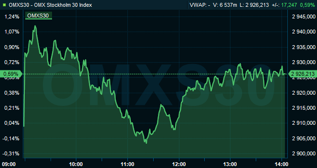 Vid 14-tiden var storbolagsindexet OMXS30 upp 0,6 procent till nivån 2.926. Aktier för omkring 10 miljarder kronor hade då bytt ägare på Stockholmsbörsen.