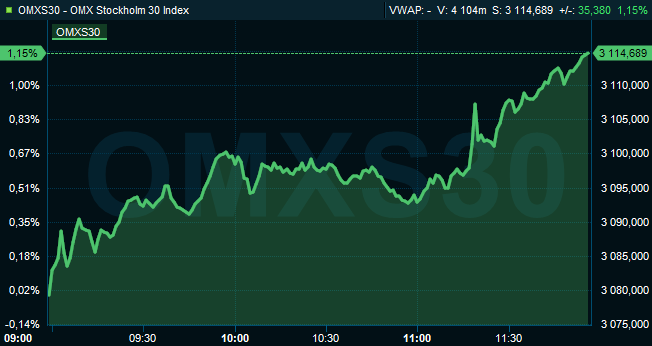 Vid 12-tiden hade storbolagsindexet OMXS30 ökat med 1,2 procent till nivån 3.115. Aktier för 6 miljarder hade då omsatts på Stockholmsbörsen i sin helhet. Ute på de ledande Europabörserna var utvecklingen inte fullt lika positiv som i Stockholm. I Frankfurt och Paris steg index med knappt 1 procent medan Londonbörsen steg med en bit under en halv procent.