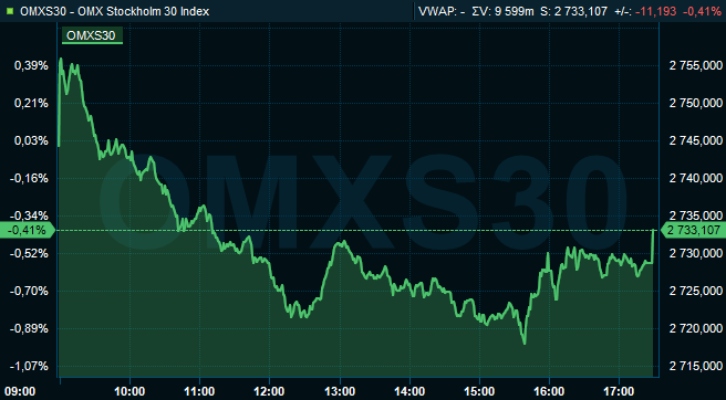 Vid stängning hade OMXS30 sjunkit 0,4% till 2 733. Aktier för 16 miljarder kronor hade då omsatts på Stockholmsbörsen i sin helhet.