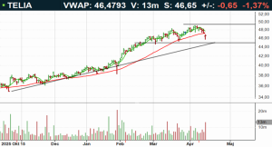 Telia-aktien handlas i positiv huvudtrend. På uppsidan möter motstånd omkring 50 kronor och på nedsidan agerar 45 kronor stöd. I skrivande stund handlas aktien omkring neutrala kursnivåer till RSI 45, ovan både 50- (46kr) och 200-dagars (39kr) glidande medelvärden. En ingång omkring stödet ger en sund balans mellan risk och potentiell avkastning. Köp på eventuell rekyl föreslås inom affärsintervallet 45-46 kronor med målkurs 52 kronor på medellång sikt. Stop loss anges vid 44 kronor.
