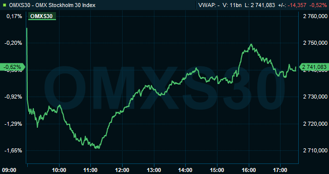 Vid stängning hade det svenska indexet OMXS30 sjunkit 0,5 procent till 2.741 och aktier för 18 miljarder kronor hade omsatts på Stockholmsbörsen.