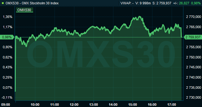 Vid börsens stängning hade OMXS30 stigit med 1,0 procent till 2.760. Aktier för 16 miljarder hade då omsatts på Stockholmsbörsen.