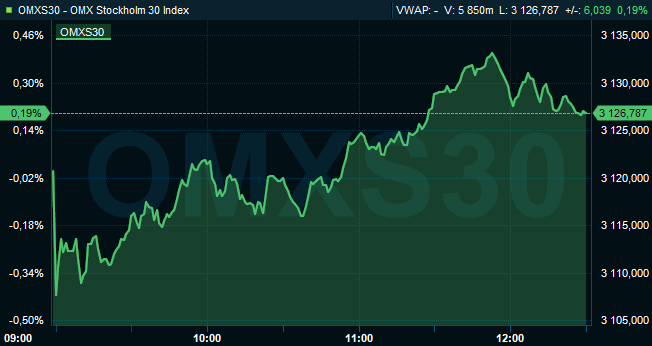 Vid 12.30—tiden hade storbolagsindexet OMXS30 stigit 0,2 procent till 3.127. Aktier för 9 miljarder kronor hade då bytt ägare på Stockholmsbörsen.