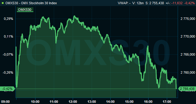 Vid stängning var det svenska storbolagsindexet OMXS30 ned 0,4 % till 2.755. Aktier för 19 miljarder kronor hade då omsatts på Stockholmsbörsen i sin helhet.
