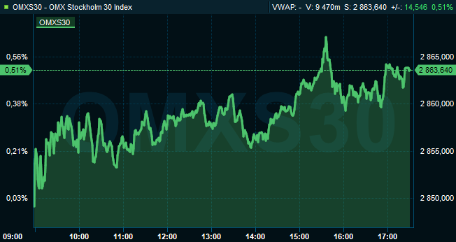 Vid börsens stängning var det svenska storbolagsindexet OMXS30 upp 0,5 procent till nivån 2.864. Aktier för 14 miljarder kronor hade då omsatts på Stockholmsbörsen.