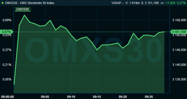 Efter ungefär en halvtimmes handel var OMXS30 upp 0,6 procent till 3.151. Aktier för lite under 3 miljarder kronor var omsatta på Stockholmsbörsen i sin helhet. Ute på de ledande Europabörserna återfanns index nära oförändrade nivåer.