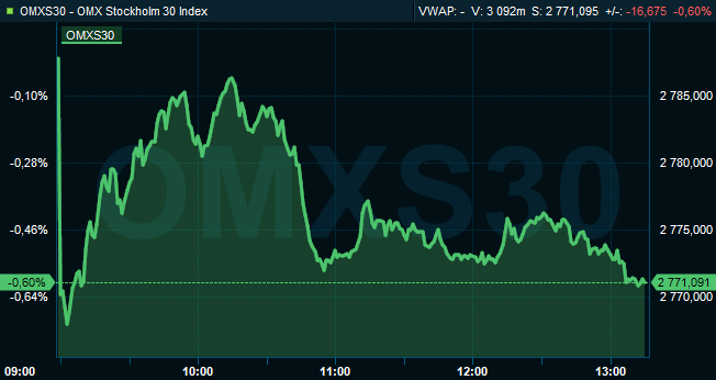 Vid 13.15-tiden hade storbolagsindexet OMXS30 backat 0,6 procent till nivån 2.771. Då hade aktier för 6 miljarder kronor bytt ägare på Stockholmsbörsen.