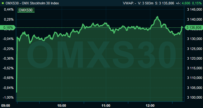 Vid 12.40-tiden hade storbolagsindexet OMXS30 i Stockholm stigit med 0,2 procent till nivån 3.136. Aktier för 6,6 miljarder kronor hade då omsatts på Stockholmsbörsen i sin helhet.