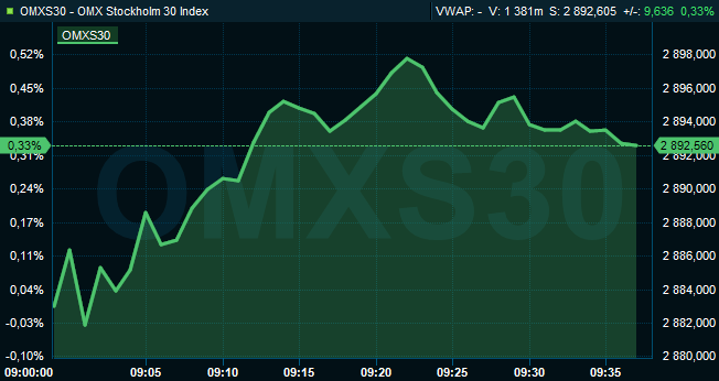 Vid 9.40-tiden var OMXS30 upp 0,3 procent till nivån 2.893. Aktier för 2 miljarder kronor hade då omsatts på Stockholmsbörsen i sin helhet.