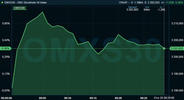 Stockholmsbörsen steg i den inledande handeln på onsdagen, en dryg halvtimme efter öppning var OMXS30 upp 0,4 procent till nivån 3.200 och breda OMXSPI upp 0,3 procent. Aktier för 2,3 miljoner kronor hade då omsatts på Stockholmsbörsen.