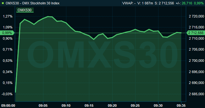 Efter drygt en halvtimmes handel hade OMXS30 stigit med 1,0 procent till 2.713. Aktier för 2 miljarder kronor hade då omsatts på Stockholmsbörsen i sin helhet. Ute på de ledande Europabörserna steg indexen med runt 1 procent.