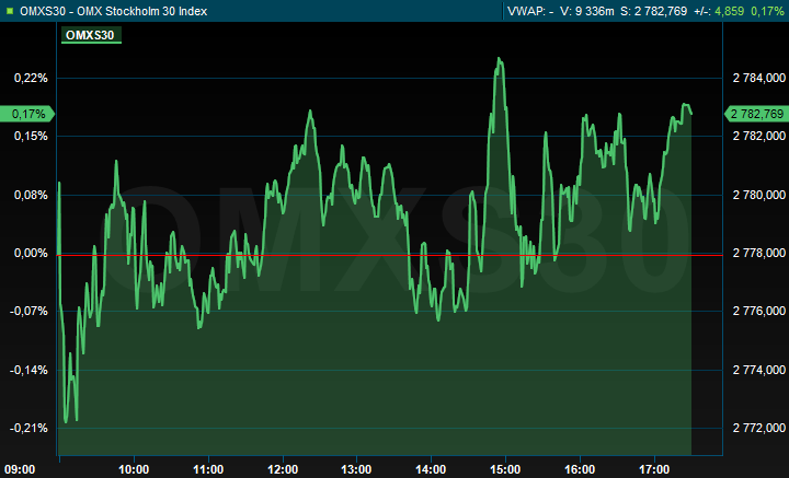 Vid stängning hade det svenska storbolagsindexet OMXS30 stigit 0,2 procent till nivån 2.783. Aktier för 16 miljarder kronor hade då omsatts på Stockholmsbörsen.