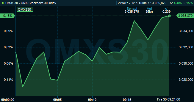 Storbolagsindex OMXS30 steg 0,1 procent till nivån 3.035.
