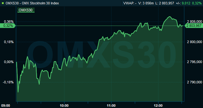 Vid 12.30-tiden hade storbolagsindexet OMXS30 stigit 0,3 procent till nivån 2.804. Aktier för drygt 5 miljarder kronor hade då omsatts på Stockholmsbörsen i sin helhet.