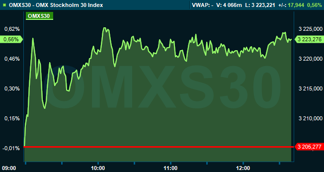 Klockan 12.40 var storbolagsindexet OMXS30 upp 0,6 procent till nivån 3.223 och breda OMXSPI steg 0,5 procent. Aktier för 6,7 miljoner kronor hade då omsatts på Stockholmsbörsen.