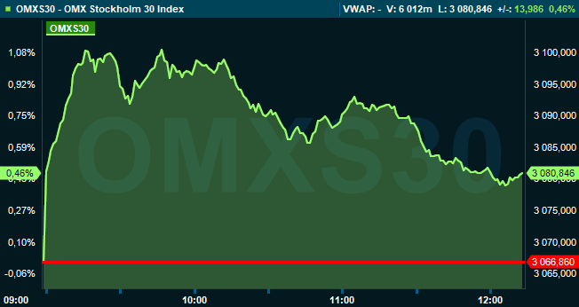 Klockan 12:10 var storbolagsindexet OMXS30 upp 0,5 procent till nivån 3.080. Aktier för 8,8 miljarder kronor hade då omsatts på Stockholmsbörsen i sin helhet.