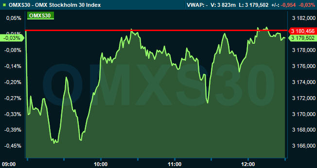 Klockan 12.30 var storbolagsindexet OMXS30 oförändrat vid 3.179. Aktieaffärer för 6,5 miljarder kronor hade då gjorts på Stockholmsbörsen.