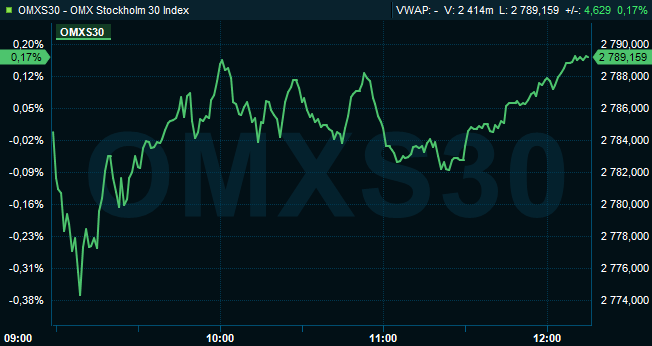 Omkring klockan 12.10 hade storbolagsindexet OMXS30 stigit 0,2 procent till 2.789 och aktier för 4,7 miljarder kronor var omsatta på Stockholmsbörsen.