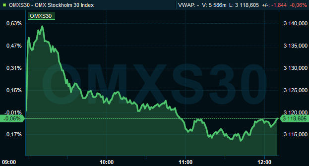 Klockan 12.10 hade storbolagsindexet OMXS30 sänkts 0,1 procent till 3.119. Aktieaffärer för 8,1 miljarder kronor hade då genomförts på Stockholmsbörsen. Utvecklingen var i linje med ledande Europabörser med undantag för Frankfurt-börsen som steg 0,3 procent.