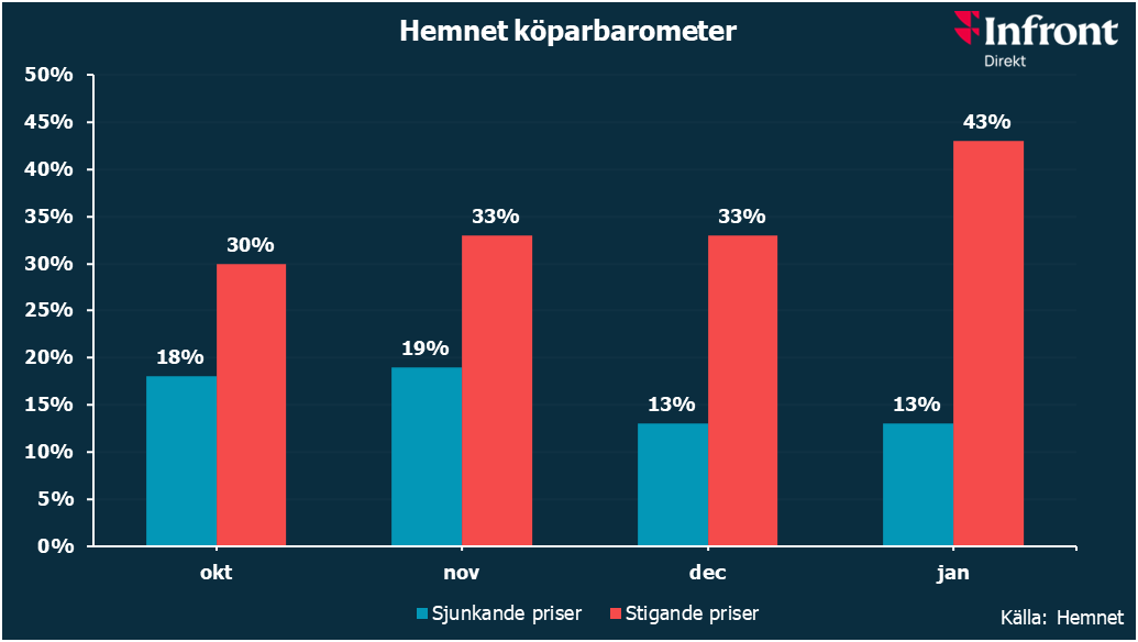 Bland besökarna på Hemnet som planerar att köpa bostad räknar nu 43 procent med stigande priser de närmaste sex månaderna, jämfört med 33 procent förra månaden. Ökningen är den största under en månad sedan mätningarna startade 2017.