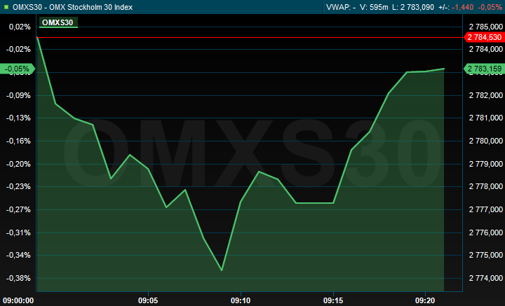 Omkring klockan 9.20 hade storbolagsindexet OMXS30 sjunkit 0,1 procent till 2.783. Aktier för 1,6 miljarder kronor hade då omsatts på Stockholmsbörsen.