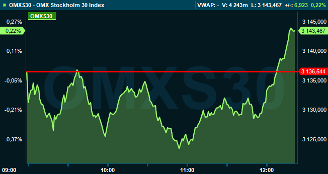 Omkring klockan 12:20 var storbolagsindexet OMSX30 upp 0,2 procent till 3.143 och aktier för 13 miljarder kronor var omsatta på Stockholmsbörsen. På de ledande Europabörserna såga en nedåtgående trend där Paris CAC 40 index sjönk 0,2 procent och Frankfurts DAX-index backade 0,1 procent.