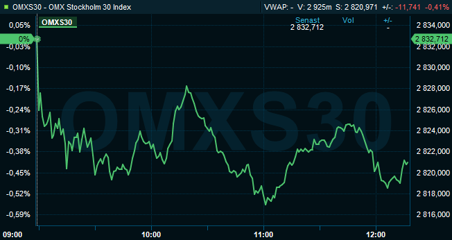 Omkring klockan 12.15 hade OMXS30 sjunkit 0,4 procent till 2.821, efter att på måndagen ha nått en ny rekordnivå. Aktier för 5,1 miljarder kronor var omsatta på Stockholmsbörsen.