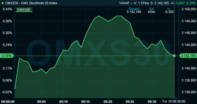 Klockan 09.30 var storbolagsindexet OMXS30 upp 0,2 procent till nivån 3.142. Då hade aktier för 2,6 miljarder kronor omsatts på Stockholmsbörsen.