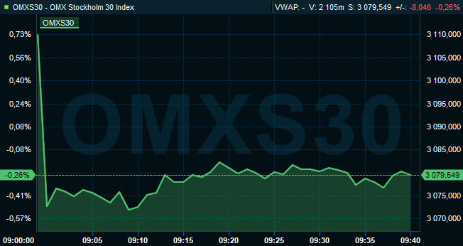 Efter en dryg halvtimmes handel hade storbolagsindexet OMXS30 minskat med 0,3 procent till nivån 3.080. Aktier för 2,9 miljarder hade då omsatts på Stockholmsbörsen i sin helhet. Ledande index i Europa hade generellt en sämre utveckling än Stockholm, med Frankfurtbörsen ned 1,2 procent.