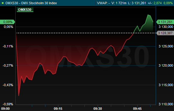 Drygt 50 minuter efter öppning vände sentimentet och storbolagsindexet OMXS30 handlades marginellt uppåt till 3.131. Då hade aktier för cirka 3,2 miljarder omsatts på Stockholmsbörsen i sin helhet.