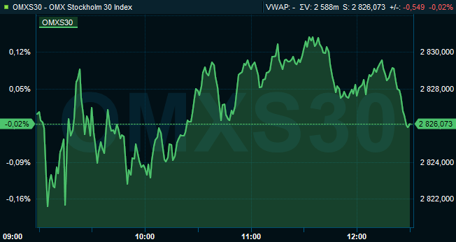 Vid 12.30-tiden var det svenska storbolagsindexet OMXS30 oförändrat vid nivån 2.826. Aktier för närmare 4,6 miljarder kronor hade då köpts och sålts på Stockholmsbörsen i sin helhet.