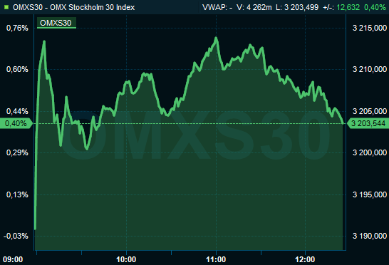 Strax före klockan 12.30 var storbolagsindexet OMXS30 upp 0,4 procent till nivån 3.204 och breda OMXSPI steg 0,3 procent. Aktier för 6,9 miljoner kronor hade då omsatts på Stockholmsbörsen. Ledande Europabörser handlades också på tydligt grönt territorium.