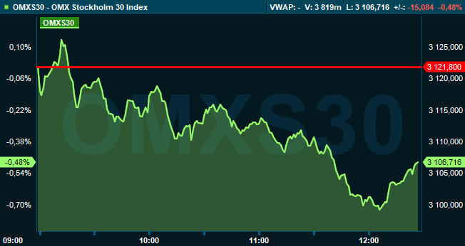 Omkring klockan 12.30 var storbolagsindexet ned 0,5 procent till 3.106 och aktier för 7 miljarder kronor hade omsatts på Stockholmsbörsen.