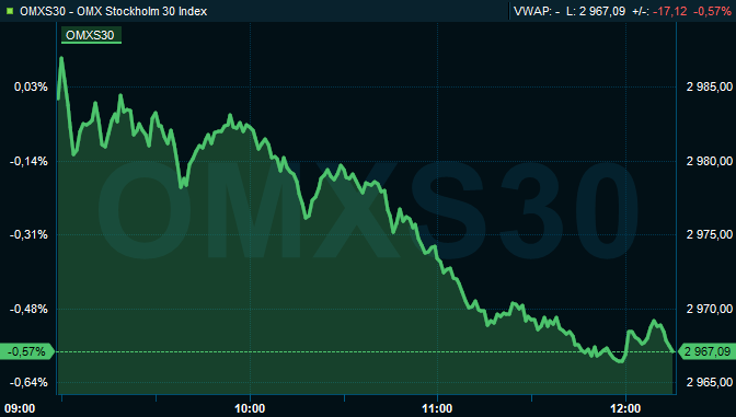 Klockan 12.15 hade det svenska storbolagsindexet OMXS30 sjunkit 0,6 procent till nivån 2.967. Aktieaffärer för 7 miljarder kronor var då omsatta på Stockholmsbörsen.