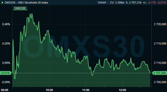 Omkring klockan 12.45 var OMXS30 oförändrat vid 2.707. Aktier för 5,2 miljarder kronor var då omsatta på Stockholmsbörsen i sin helhet. Ute på de ledande Europabörserna steg index i London med 0,2 procent medan Frankfurtbörsen och Parisbörsen var upp med 0,4 procent vardera.
