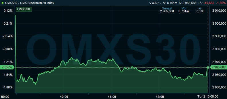 Storbolagsindexet OMXS30 avslutade ned 1,4 procent vid nivån 2.966. Aktier för 13 miljarder bytte ägare på Stockholmsbörsen i sin helhet.