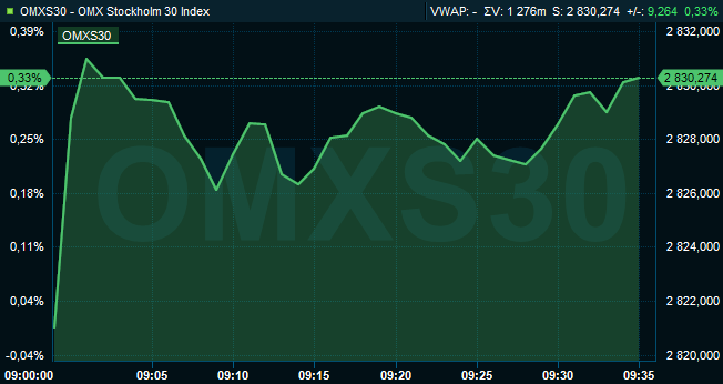 Omkring klockan 9.35 var storbolagsindexet OMXS30 upp 0,3 procent till 2.830. Aktier för cirka 2 miljarder kronor hade då omsatts på Stockholmsbörsen i sin helhet.