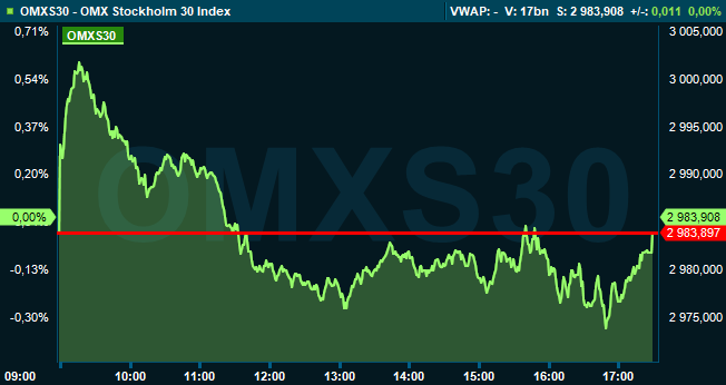 Vid stängning var det svenska storbolagsindexet OMXS30 oförändrat vid 2.983. Aktieaffärer för 25 miljarder kronor hade gjorts på Stockholmsbörsen.