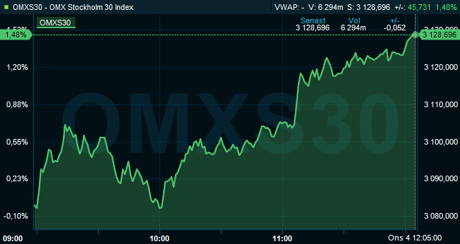 OMXS30 stärktes 1,5 procent till nivån 3.128, och tar därmed igen delar av det 4-procentiga tappet i spåren av Iran-konflikten. Aktier för knappt 8,8 miljarder kronor hade då omsatts på Stockholmsbörsen i sin helhet.