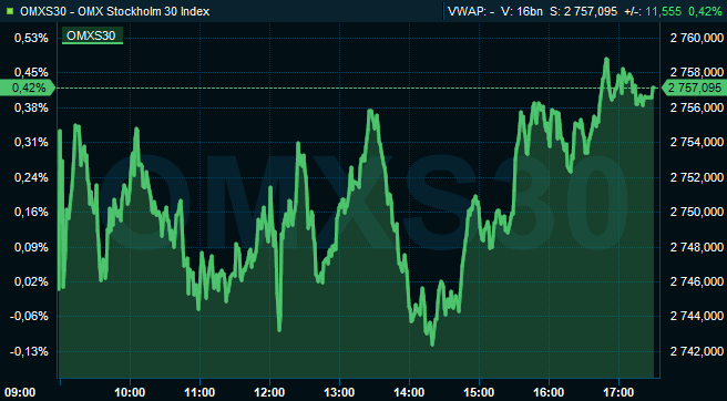 Vid börsens stängning hade storbolagsindexet OMXS30 stigit med 0,4 procent till 2.757. Aktier för 27 miljarder kronor hade då omsatts på Stockholmsbörsen.