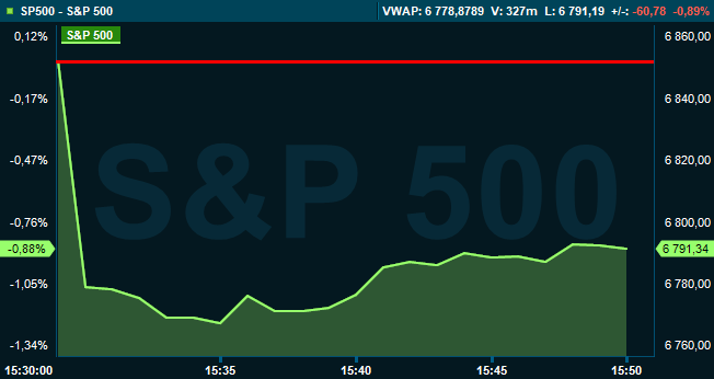 Vid 15.50-tiden var Dow Jones industriindex ned 0,5% till 47.119, medan breda S&P 500 var ned 0,9% vid 6.791. Även tekniktunga Nasdaq Composite försvagades med 1,0% till 23.599.