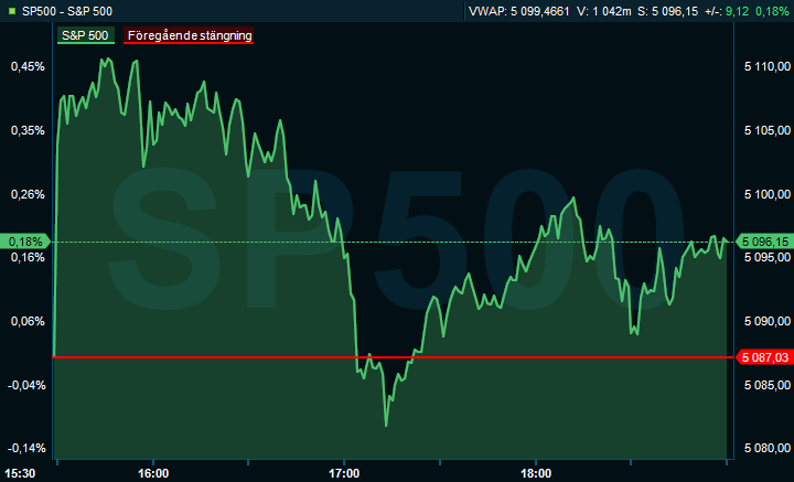 Omkring klockan 19 var S&P 500 upp 0,2 procent till 5.096. Dow Jones industriindex steg lika mycket till 39.162, samtidigt som Nasdaq Composite var oförändrat vid 16.043.