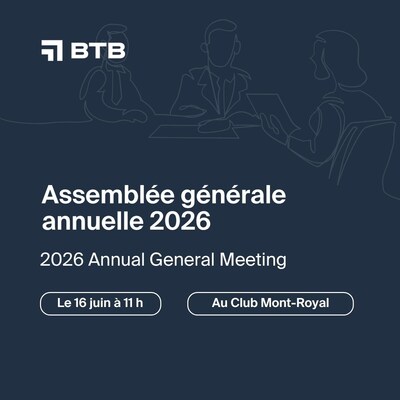 MONTRÉAL , April 27, 2026 /CNW/ - BTB Real Estate Investment Trust (TSX: BTB.UN) (" BTB " or the " REIT ") announces its Annual General Meeting of unitholders (the " Meeting " or " AGM ") will be held on Tuesday, June 16, 2026, at 11:00 a.m. (Eastern Time).