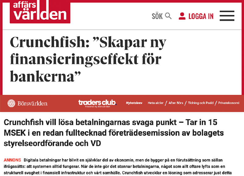 In the editorial Crunchfish: ”Skapar ny finansieringseffekt för bankerna” by Affärsvärlden, the economic dimension of Crunchfish’s technology is highlighted, describing how offline reservations can create a new funding dynamic for financial institutions.