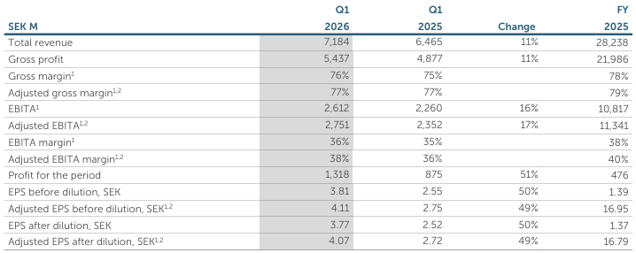 •Earnings per share (EPS) before dilution was SEK 3.81 (2.55) and EPS after dilution was SEK 3.77 (2.52). Adjusted EPS before dilution1 was SEK 4.11 (2.75) and adjusted EPS after dilution1 was SEK 4.07 (2.72)