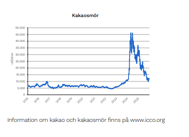 De tidigare skyhöga kakaopriserna har dock kommit ned rejält sedan toppnivåerna 2024.